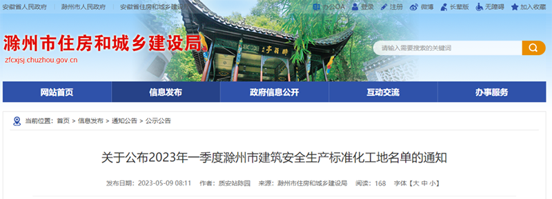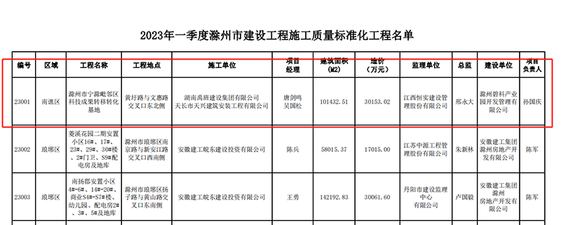 近日,滁州市住房和城乡建设局网站发布关于公布2023年一季度滁州市建筑安全生产标准化工地名单的通知,由2025新澳门原材料承监的滁州市宁滁毗邻区科技成果转移转化基地项目获得表彰。