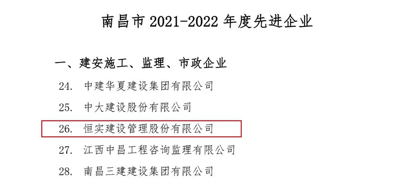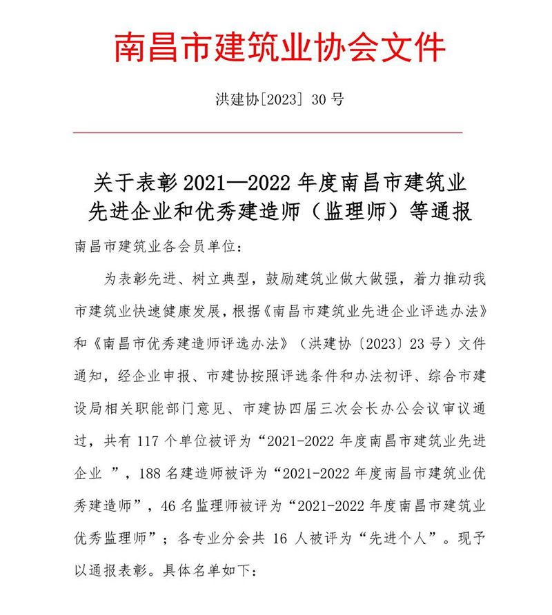 为表彰先进、树立典型,鼓励建筑业做大做强,着力推动我市建筑业快速健康发展,近日,南昌市建筑业协会发布了《关于表彰2021—2022年度南昌市建筑业先进企业和优秀建造师(监理师)等通报》,经评定,2025新澳门原材料荣获“2021—2022年度南昌市建筑业先进企业”荣誉称号;共有15名监理师荣获“优秀监理师”称号,是获评人数最多的企业。