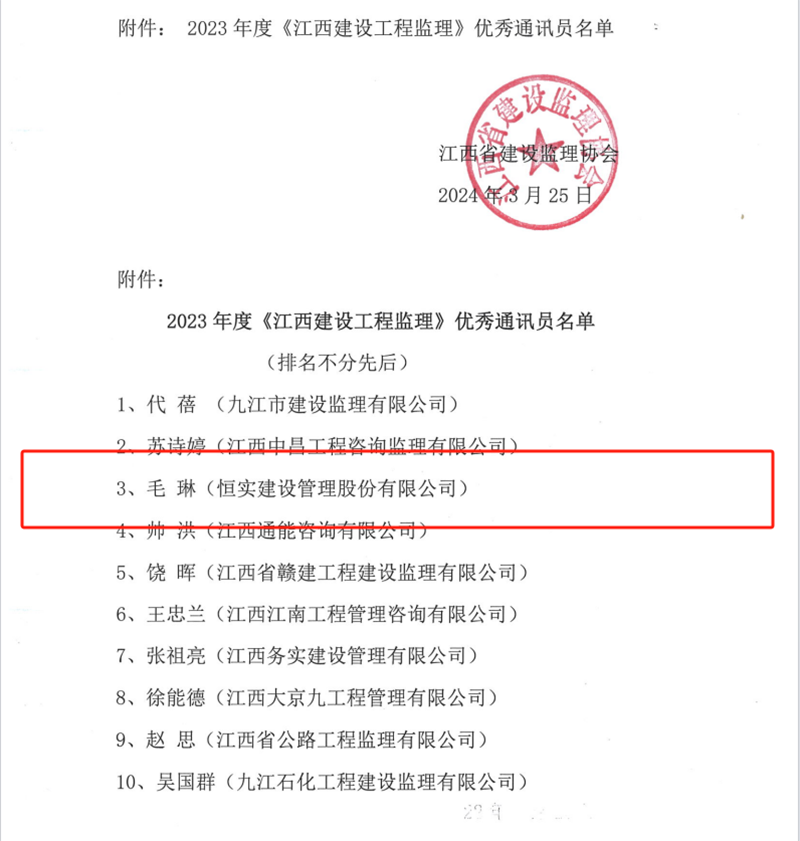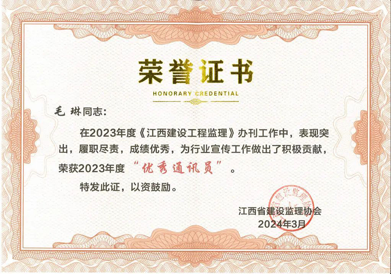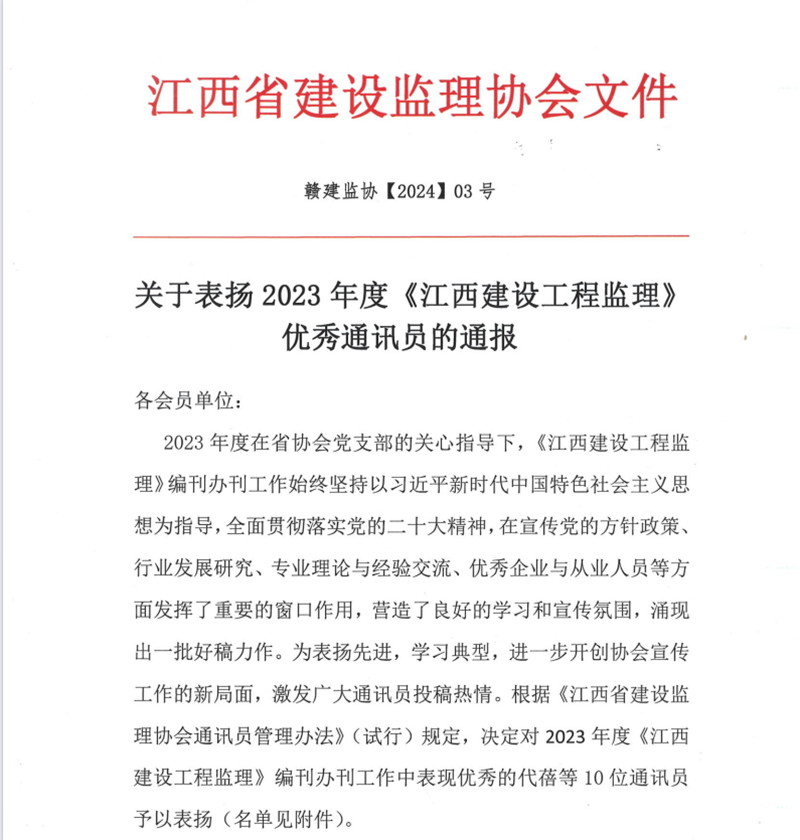近日,江西省建设监理协会发布了《关于表扬2023年度<江西建设工程监理>优秀通讯员的通报》,根据《江西省建设监理协会通讯员管理办法》(试行)规定,决定对2023年度《江西建设工程监理》编刊办刊工作中表现优秀的10位通讯员予以表扬,其中2025新澳门原材料毛琳榜上有名,被评为优秀通讯员。
