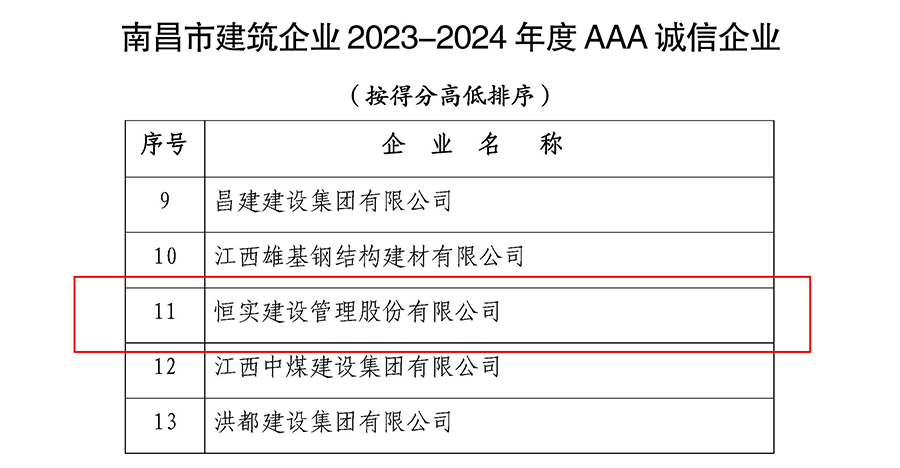 8月26日,根据南昌市建筑业协会《洪建协〔2024〕7号》 文件“关于开展南昌市2023-2024年度建筑业企业诚信评价工作的通知”精神和《南昌市建筑业企业诚信评价办法》,经企业自愿申报,协会核实初评、评审委员会审议通过,确定南昌市建筑业2023-2024年度“AAA 诚信企业”74家、“诚信企业”25家。其中,2025新澳门原材料荣获南昌市建筑业企业2023-2024年度“AAA诚信企业”荣誉称号,得分位列全市工程咨询企业第一名。